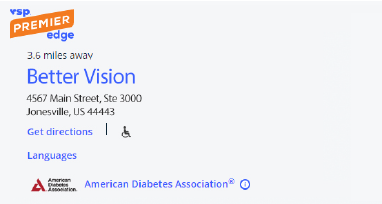 The American Diabetes Association (ADA) badge helps your practice stand out to the hundreds of thousands of patients who visit the VSP® Find a Doctor Directory on vsp.com each month. Locations displaying the ADA badge receive nearly 2X as many clicks to their appointment scheduler compared to those without a badge.*